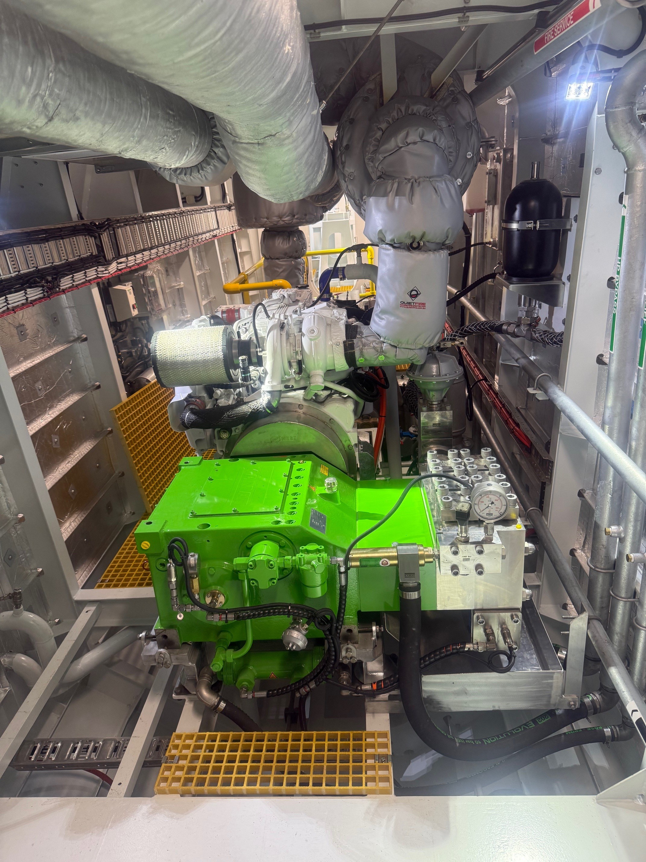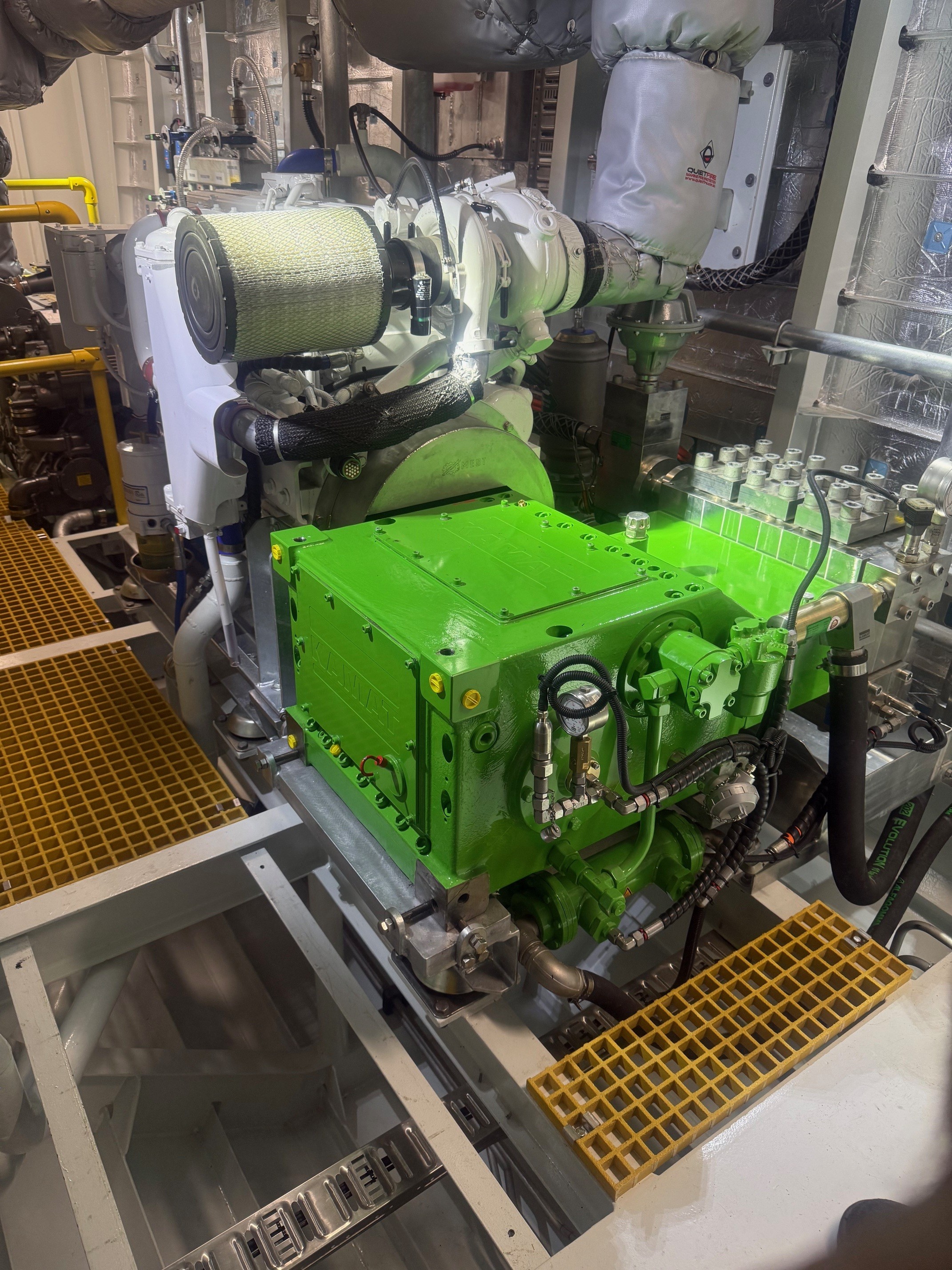 This latest installation features a KAMAT pump delivering approximately 285 bar at 500 LPM, providing the consistent power required for demanding aquaculture operations. These pumps continue to prove their performance in harsh marine environments, cleaning these nets continuously, which is critical for the salmon to remain healthy.