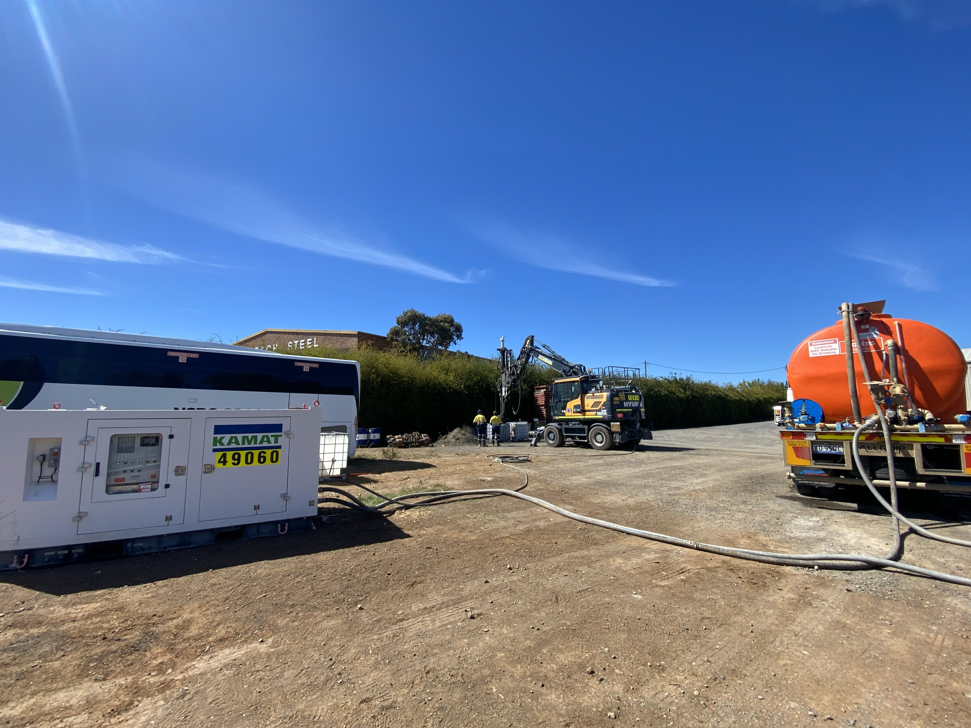 Manufactured in Germany by KAMAT, the high-pressure pump systems are designed to supply water to specialised hammer drill attachments mounted on excavators. The use of high-pressure water supports efficient and controlled drilling, helping to reduce mechanical wear, dust, and improve overall energy efficiency while creating critical drainage holes required for the project’s infrastructure.